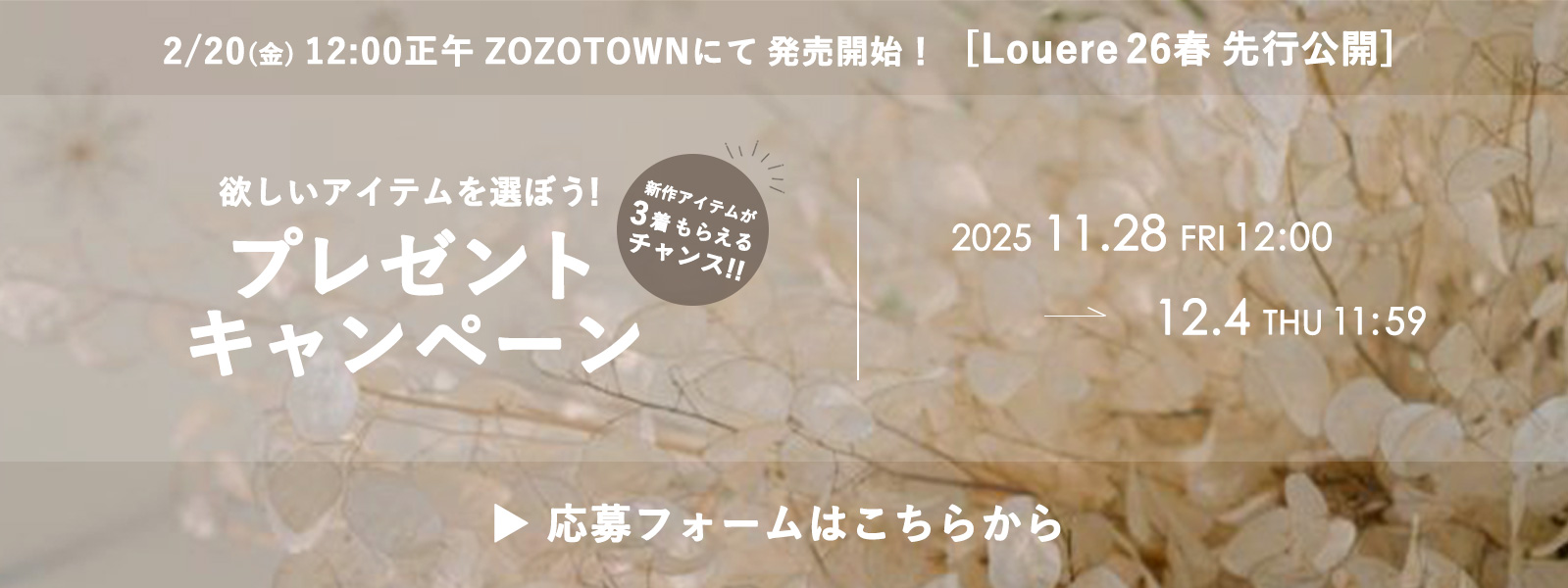 .【Louere26春先行公開】欲しいアイテムを選ぼう!プレゼントキャンペーン!2/20(金)から発売開始の26春物LOOKより欲しい商品3アイテムを選んでください!当キャンペーン参加者が選んだ投票数によって、1~3位までの人気順通りに結果が揃った方には、選んだ3アイテムをプレゼント🎁あなたの投票も結果に影響します!たくさんのご応募お待ちしております♪※当キャンペーン参加者の全投票を合算し、投票数が一番多い商品から順番に1位から3位まで決定いたします。【参加方法】1.当キャンペーン専用のLOOKから2/20(金)から発売開始の26春物LOOKを見て欲しい3アイテムを考える。※プロフィールリンク「Louere プレゼントキャンペーンLOOKBOOK」よりご確認ください。2.専用LOOKページ内の応募フォームから必要事項を記入いただき、1~3番まで欲しい商品名を選んで送信。【応募期間】2025年11月28日(水)12:00~ 2025年12月4日(木)11:59【結果発表】2月6日(金)にLouere公式Instagram(@louere.official)投稿にてご報告いたします。プレゼント当選者には同日にDMにてご連絡差し上げます。※DMにて3商品のご希望カラー、サイズ及び配送に必要な情報をお伺いいたします。※DMのご返信は2月12日(木)までにお願いいたします。※プレゼントの配送はご返信いただいてから順次配送予定となります。【応募条件】以下の条件をすべて満たすことが必要です。① Louere公式Instagram(@louere.official)をフォローしている方。② InstagramDMの受信設定を許可にしている方。③ 日本国内に在住であり、プレゼントの発送先が日本国内である方。■キャンペーン応募規約本キャンペーンにご応募いただいた時点で、以下の内容にご同意いただいたものとみなします。※お一人様一回のみ有効投票になります。※複数投票されたお客様は最後に投票された内容が適用されます。それ以前の投票内容は無効になりますのでご注意ください。※間違えて投票された場合は、再度追加で投票してください。最後に投票された内容を反映します。※当選されたお客様へは、フォーム記載のアカウントへDMにてご連絡いたします。誤ったアカウント名を記入されますとプレゼントは無効となりますのでご注意ください。※弊社の独断で不正と判断される投票は無効とさせていただきますのでご注意ください。※当キャンペーンは弊社の判断で予告なく応募期間の変更及び中止する場合があります。#louere #ルエレ #プレゼントキャンペーン #プレゼント企画 #26春