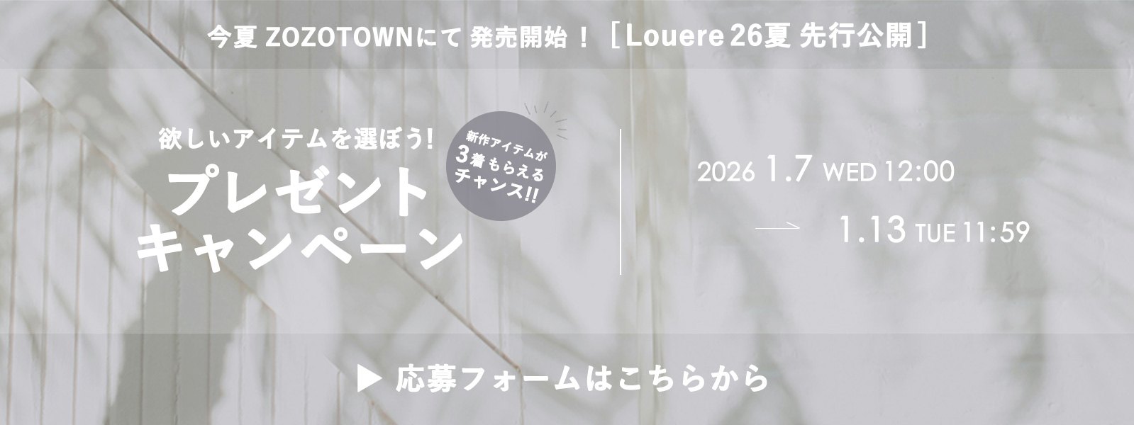 .【Louere26夏先行公開】欲しいアイテムを選ぼう!プレゼントキャンペーン!4月上旬から発売開始の26夏LOOKより欲しい商品3アイテムを選んでください!当キャンペーン参加者が選んだ投票数によって、1~3位までの人気順通りに結果が揃った方には、選んだ3アイテムをプレゼント🎁あなたの投票も結果に影響します!たくさんのご応募お待ちしております♪※当キャンペーン参加者の全投票を合算し、投票数が一番多い商品から順番に1位から3位まで決定いたします。【参加方法】1.当キャンペーン専用のLOOKから4月上旬発売開始の26夏物を見て欲しい3アイテムを考える。※プロフィールリンク「26夏キャンペーン特設ページ」よりご確認ください。2.専用LOOKページ内の応募フォームから必要事項を記入いただき、1~3番まで欲しい商品名を選んで送信。【応募期間】2026年1月7日(水)12:00~ 2026年1月13日(火)11:59【結果発表】3月下旬頃に公式Instagram(@louere.official)の投稿にてご報告いたします。プレゼント当選者にも同日にDMにてご連絡差し上げます。※DMにて3商品のご希望カラー、サイズ及び配送に必要な情報をお伺いいたします。※DMのご返信は1週間以内にお願いいたします。※プレゼントの配送はご返信いただいてから順次配送予定となります。【応募条件】以下の条件をすべて満たすことが必要です。① Louere公式Instagram(@louere.official)をフォローしている方。② InstagramDMの受信設定を許可にしている方。③ 日本国内に在住であり、プレゼントの発送先が日本国内である方。■キャンペーン応募規約本キャンペーンにご応募いただいた時点で、以下の内容にご同意いただいたものとみなします。※お一人様一回のみ有効投票になります。※複数投票されたお客様は最後に投票された内容が適用されます。それ以前の投票内容は無効になりますのでご注意ください。※間違えて投票された場合は、再度追加で投票してください。最後に投票された内容を反映します。※当選されたお客様へは、フォーム記載のアカウントへDMにてご連絡いたします。誤ったアカウント名を記入されますとプレゼントは無効となりますのでご注意ください。※弊社の独断で不正と判断される投票は無効とさせていただきますのでご注意ください。※当キャンペーンは弊社の判断で予告なく応募期間の変更及び中止する場合があります。#Louere #ルエレ #プレゼントキャンペーン #プレゼント企画 #26夏