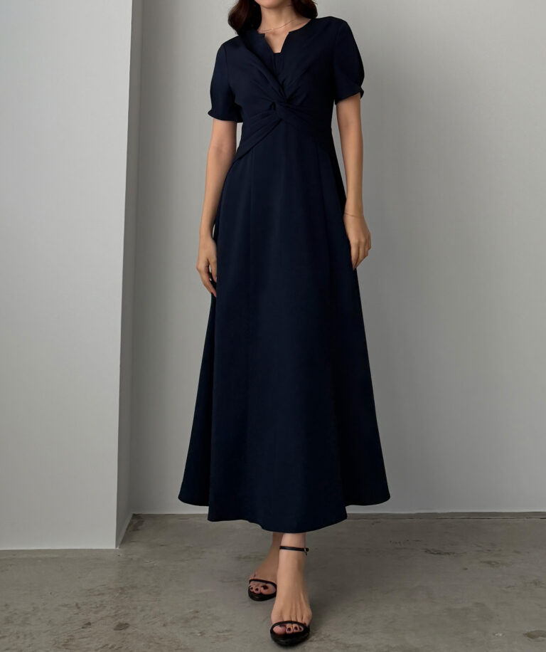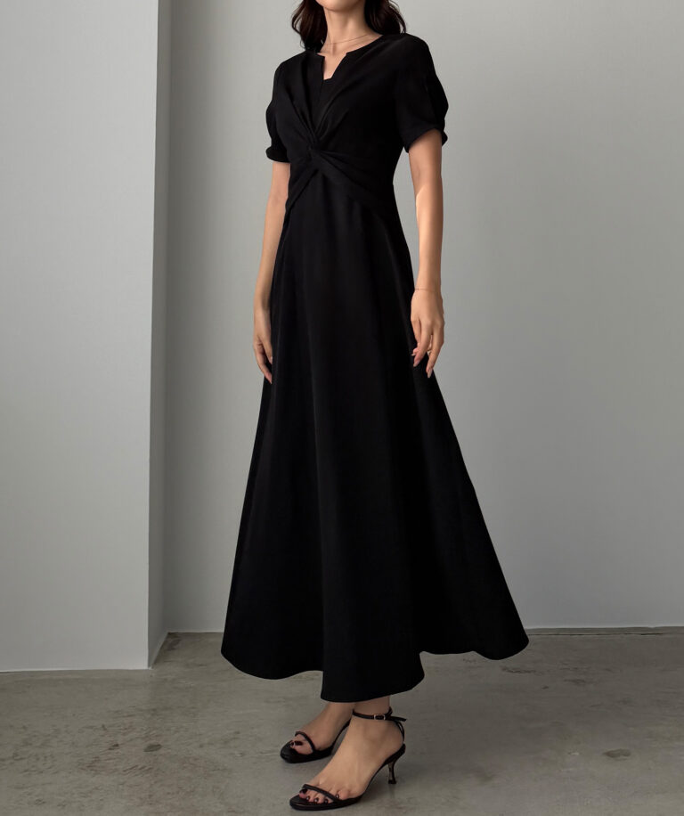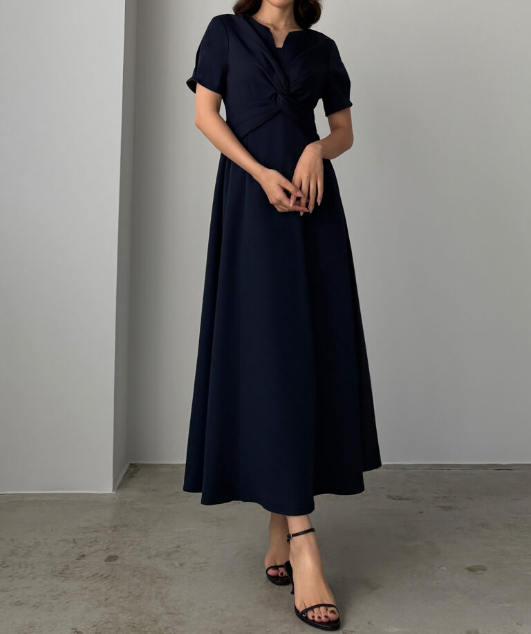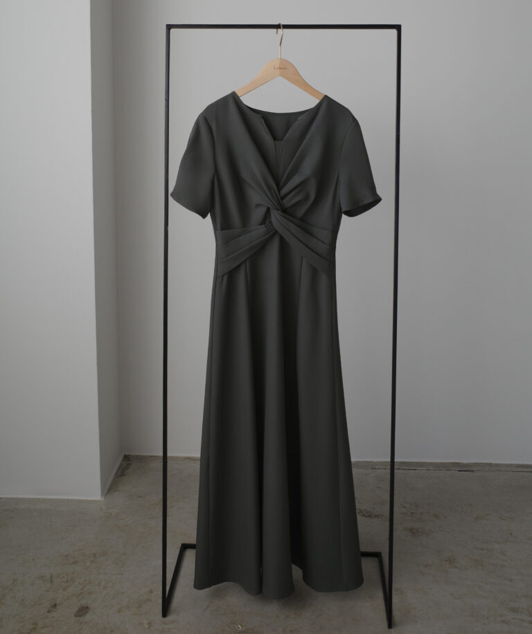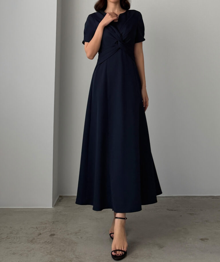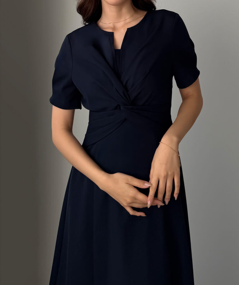 胸元の大胆なツイストデザインが華やかなワンピース。