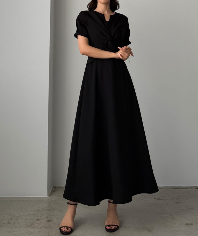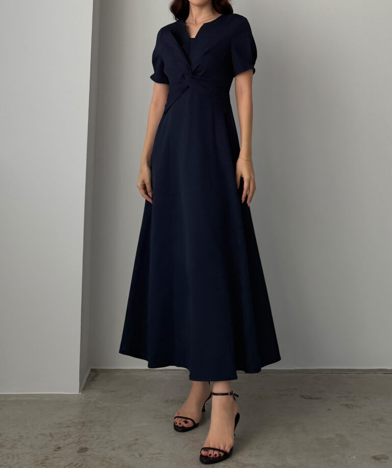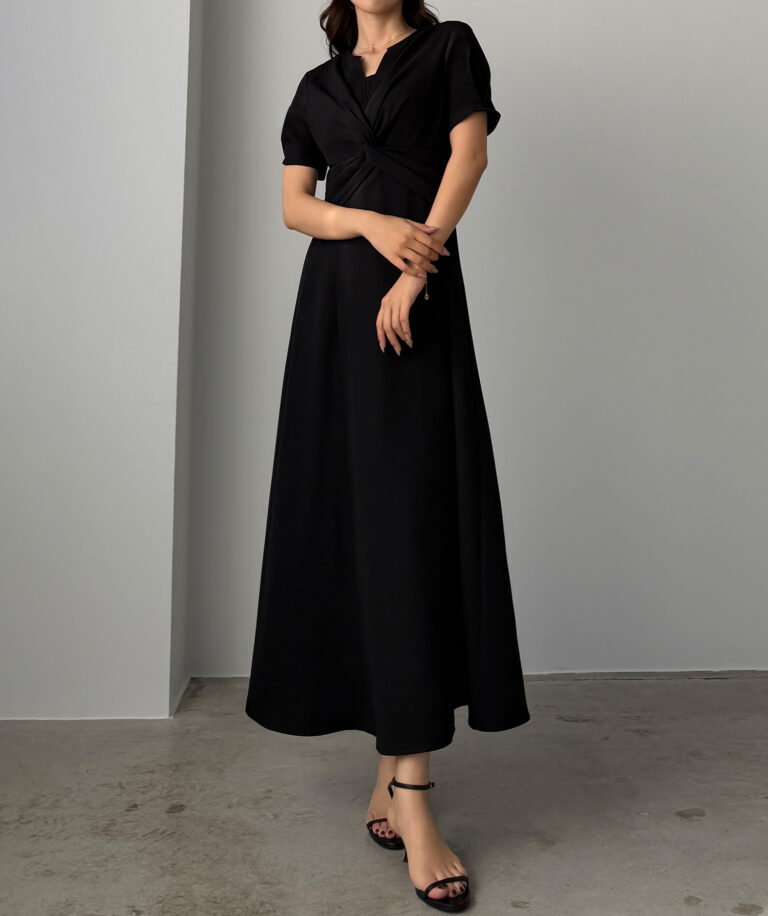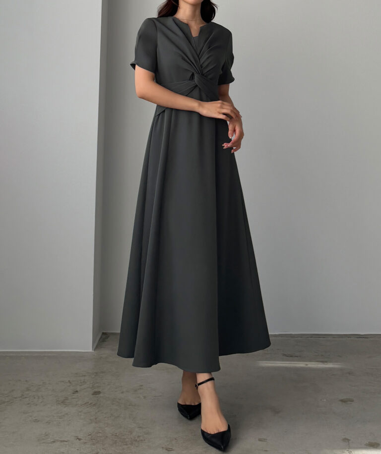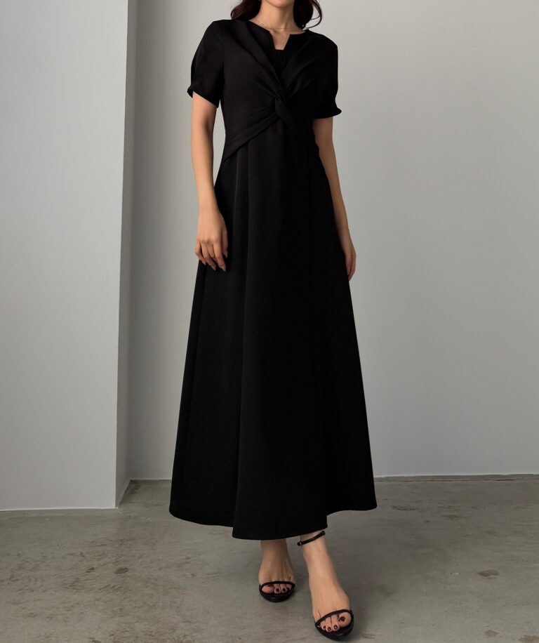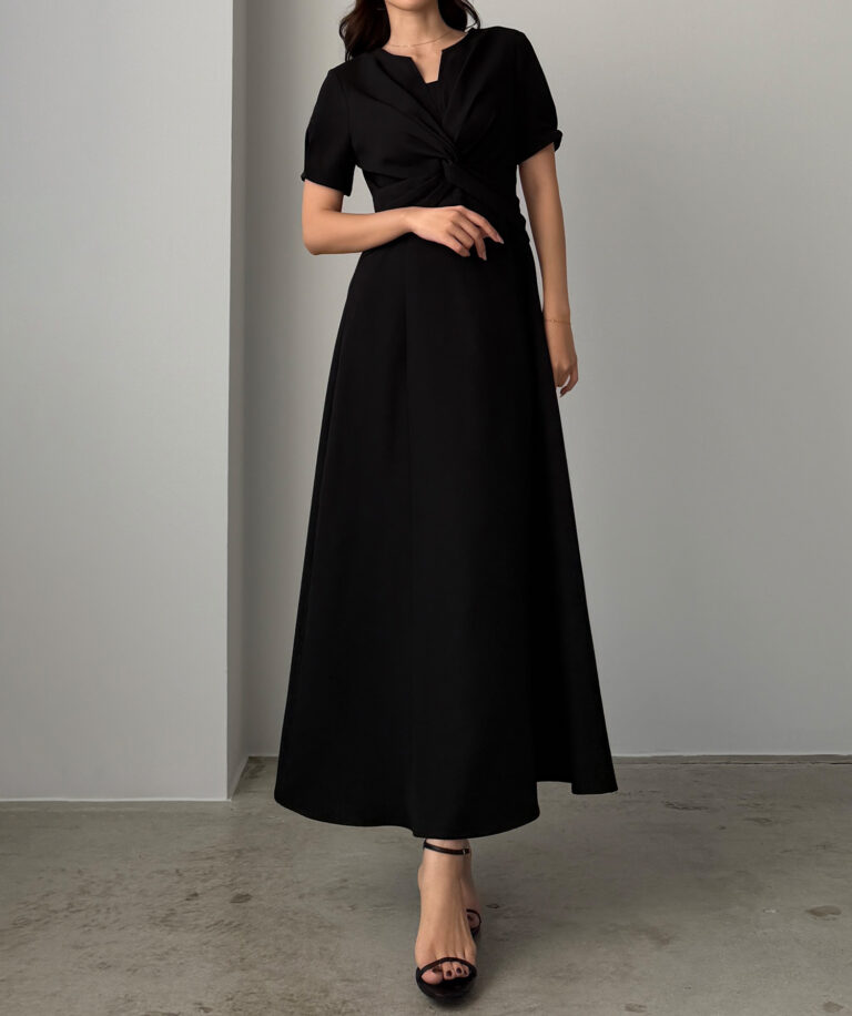 胸元の大胆なツイストデザインが華やかなワンピース。