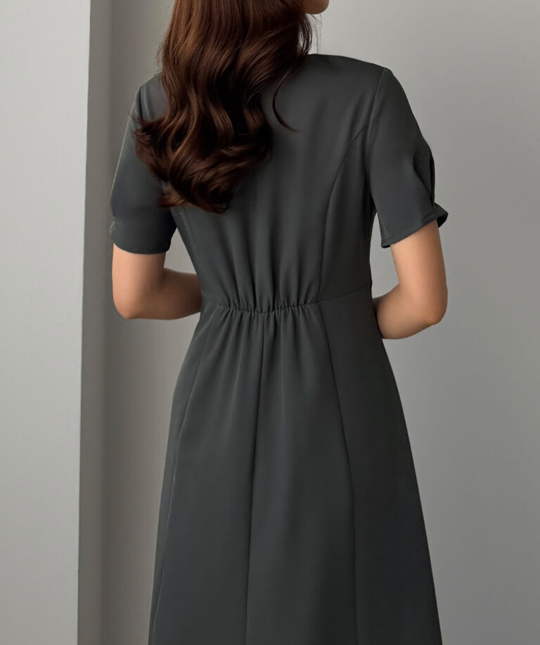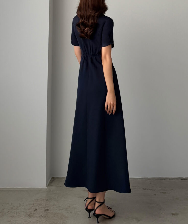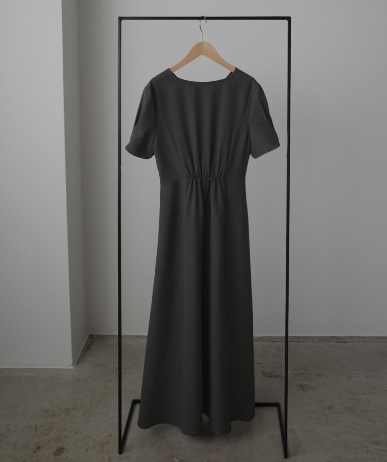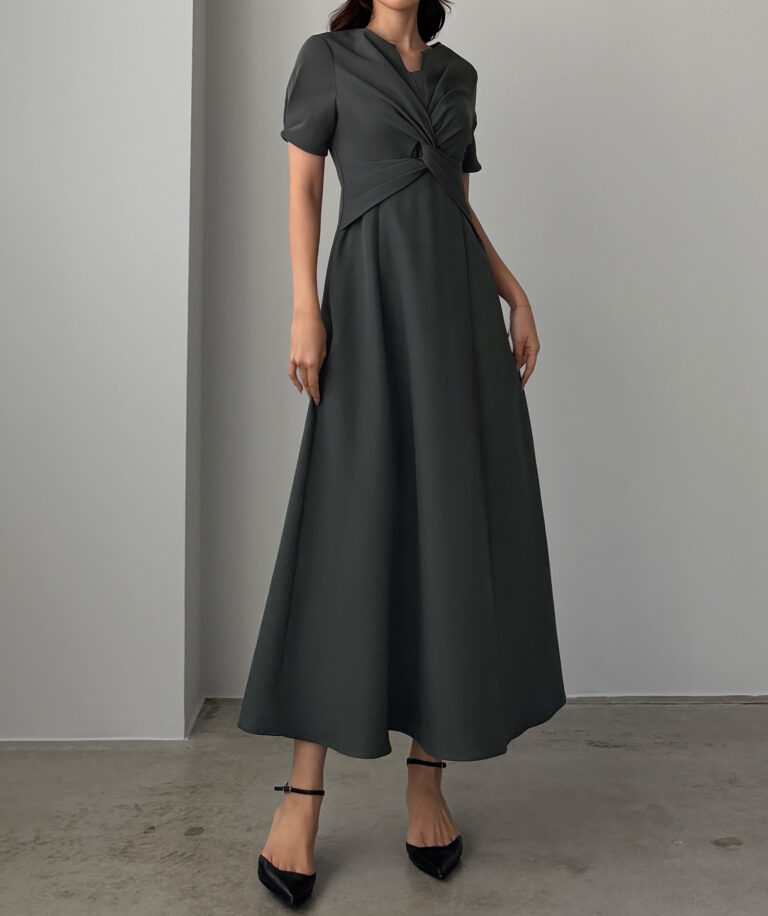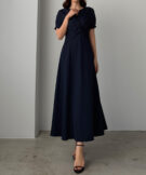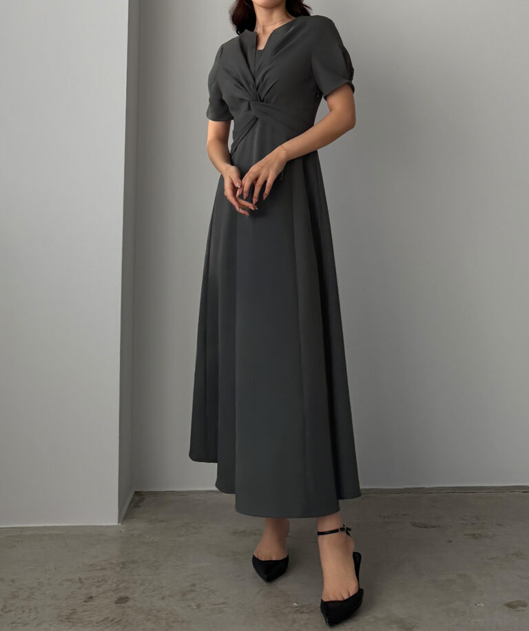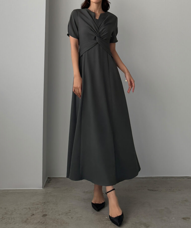 胸元の大胆なツイストデザインが華やかなワンピース。