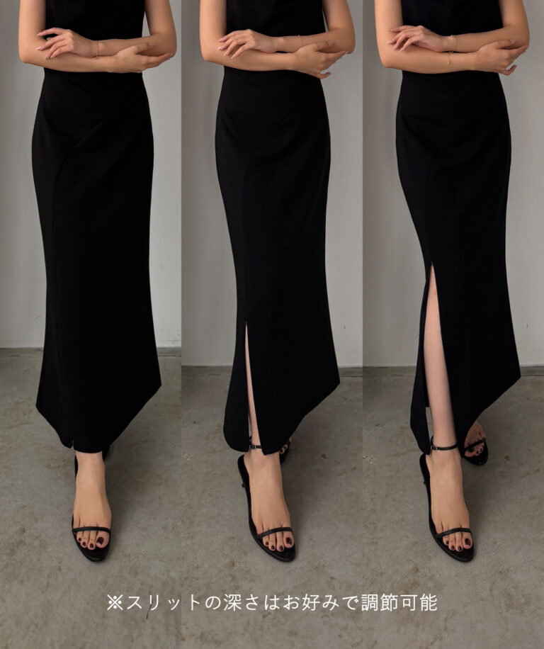 前スリットからはチラッと足元が見え、大人の抜け感を演出。