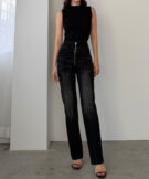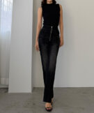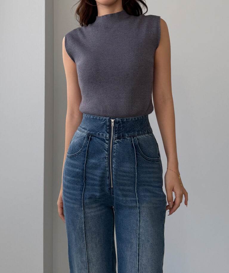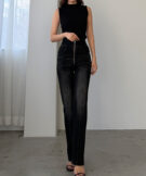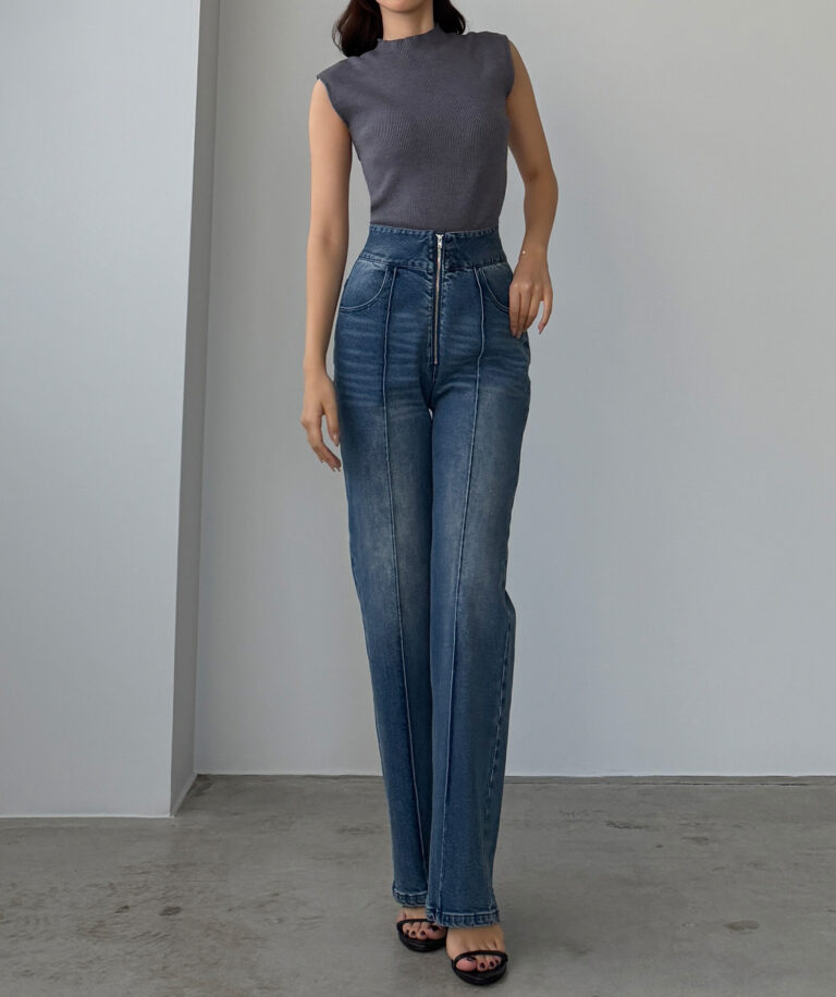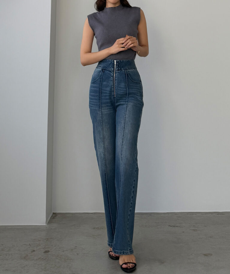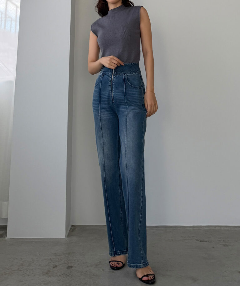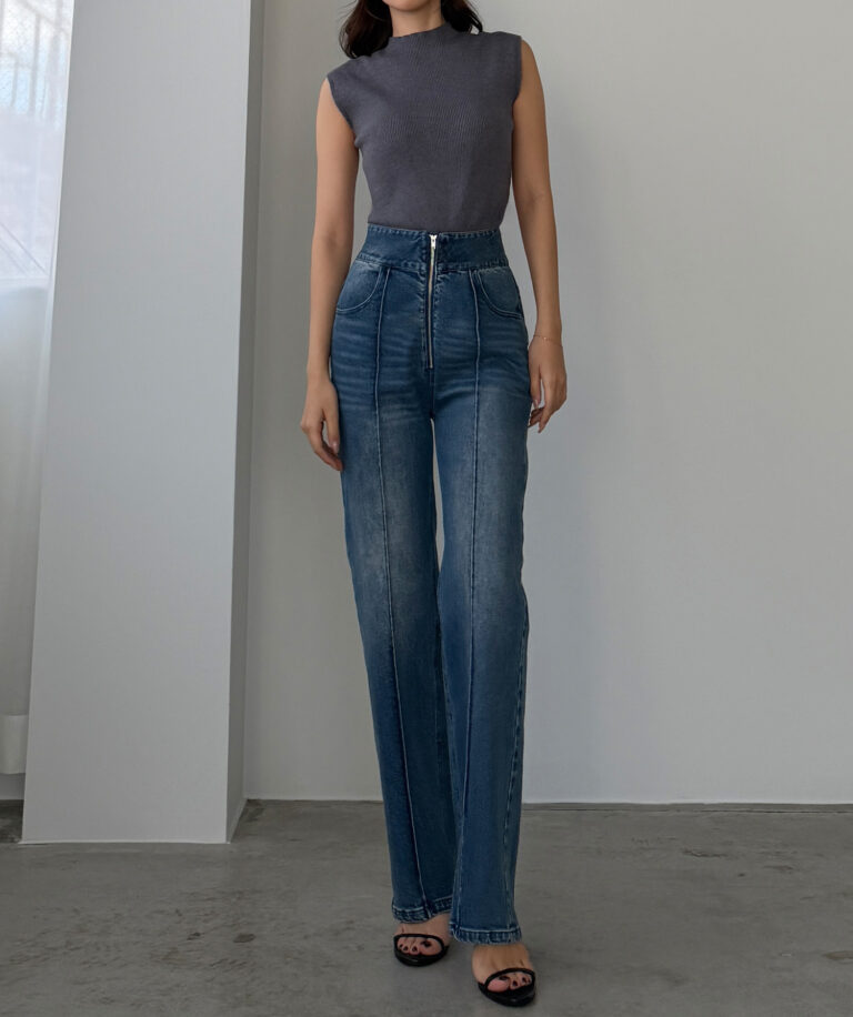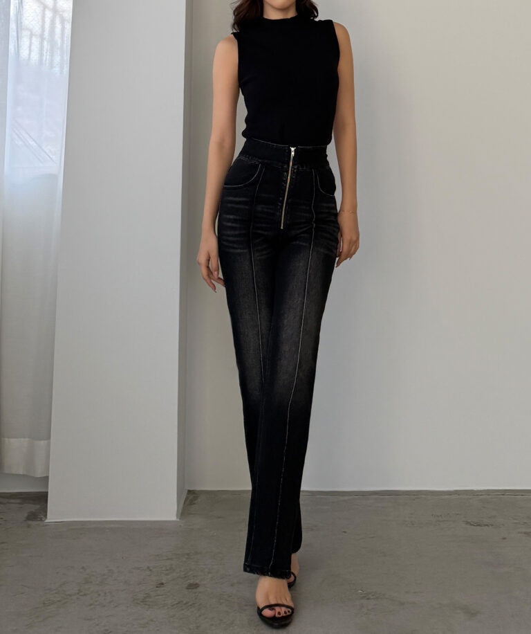 【652】ハイウエストファスナーデザインストレッチストレートデニムパンツ[高身長サイズST有り]