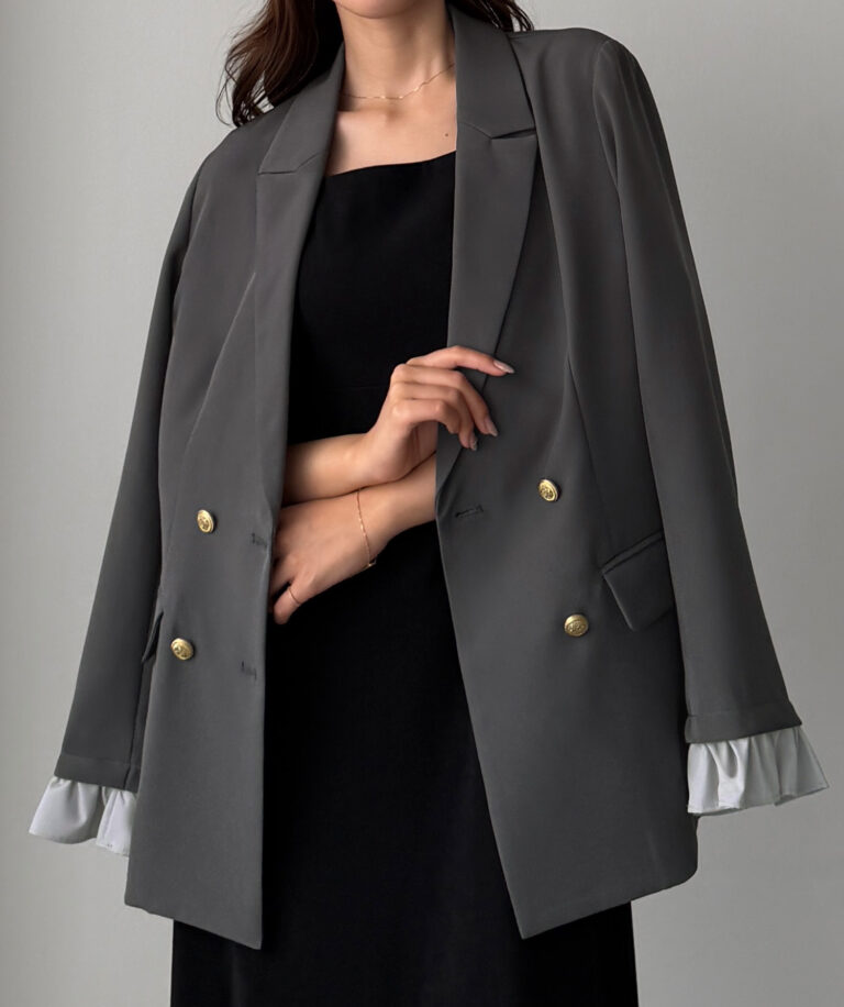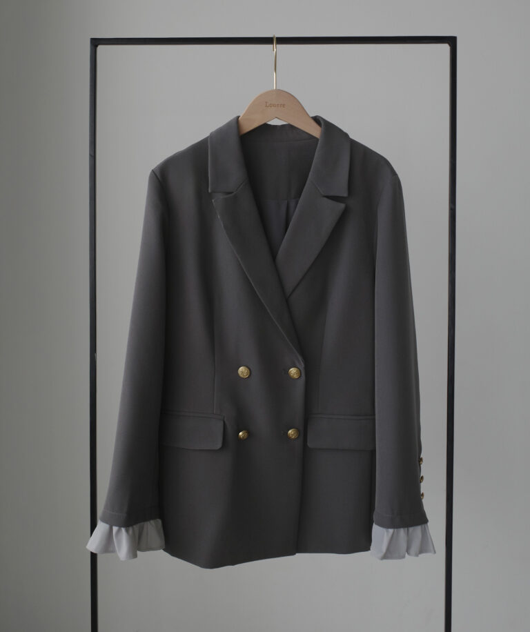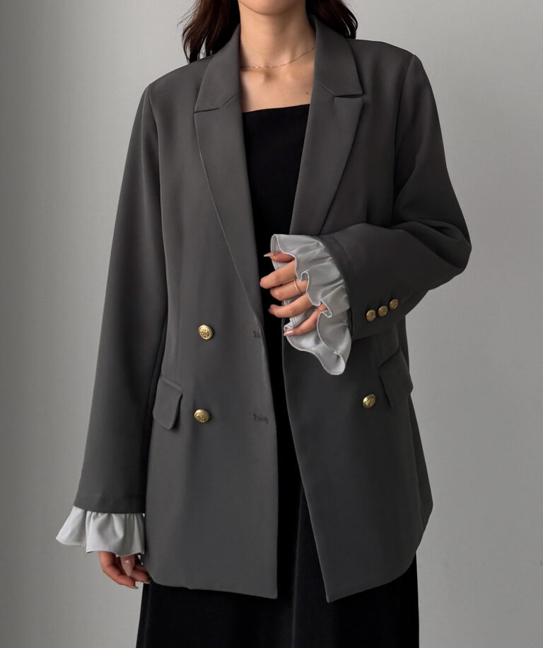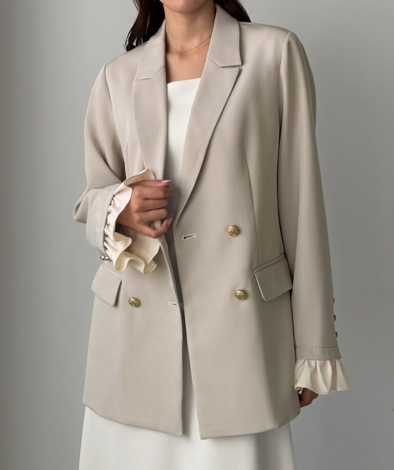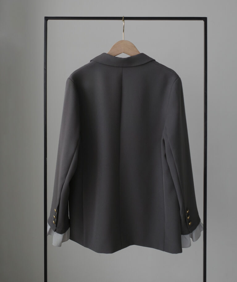 ベーシックなテーラードジャケットの袖口にフリルを施し、
