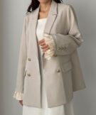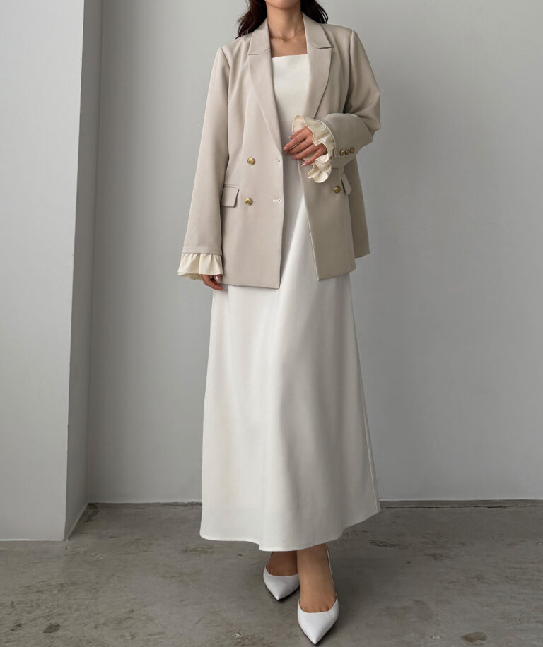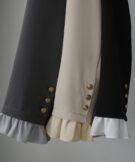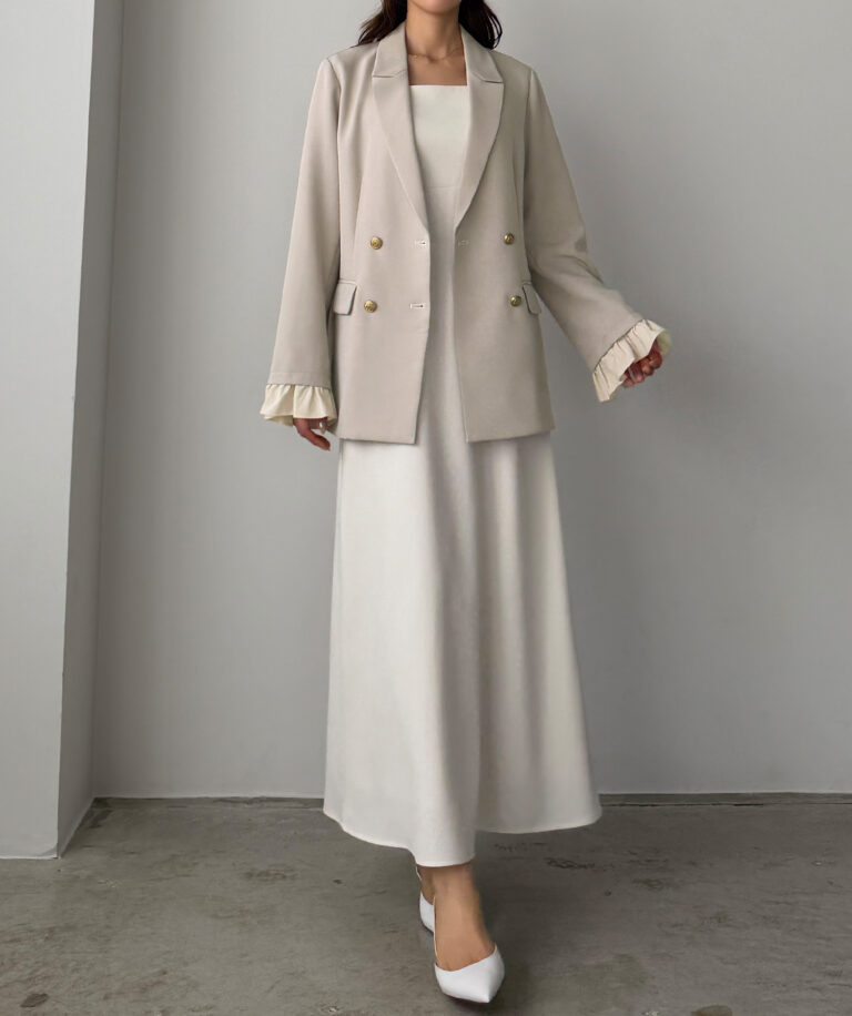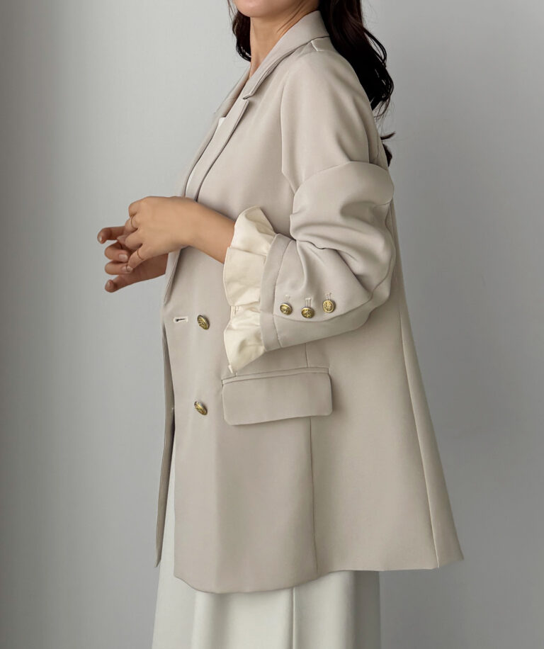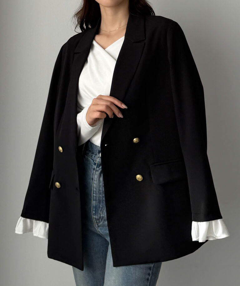 ベーシックなテーラードジャケットの袖口にフリルを施し、