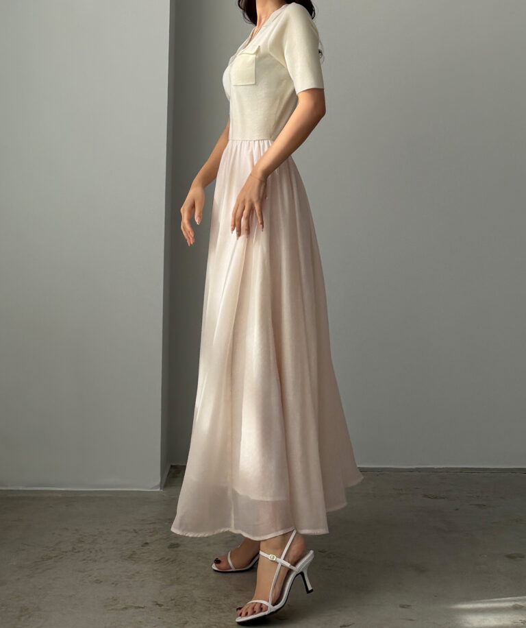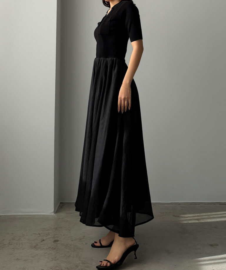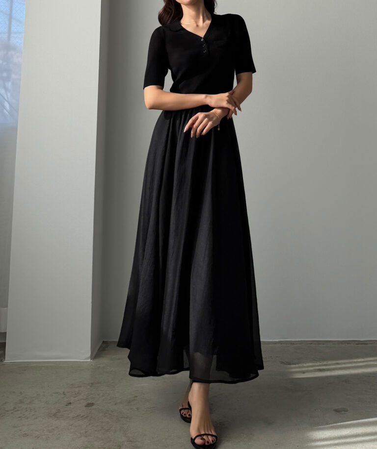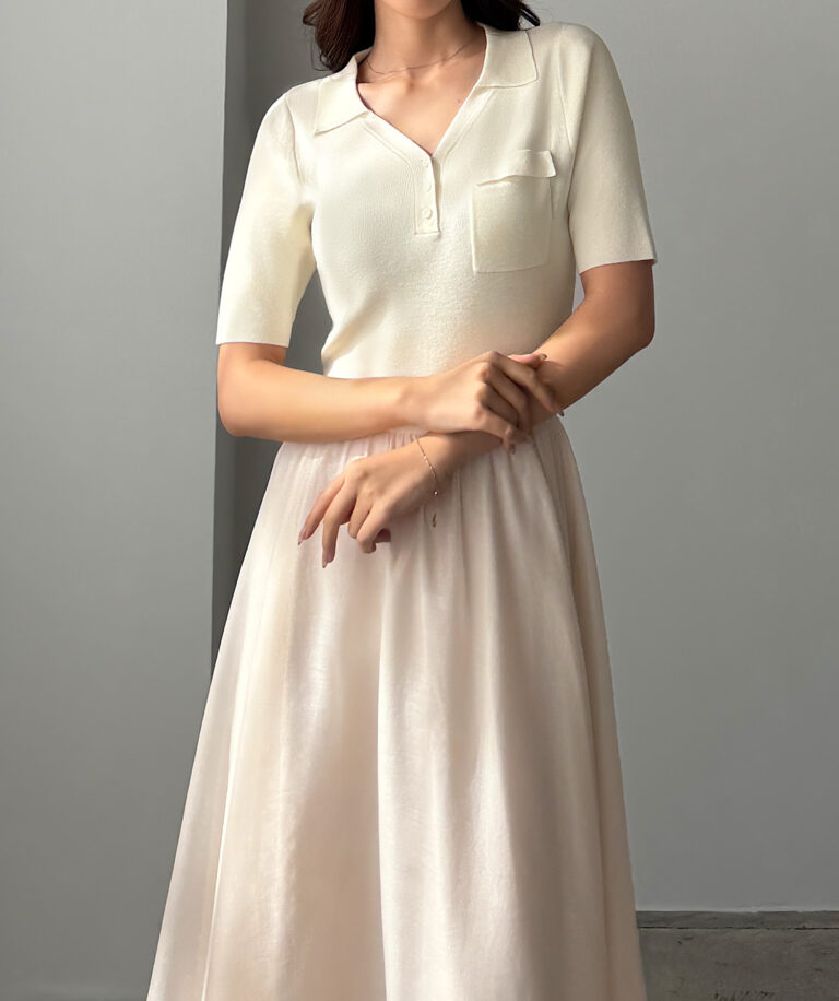 ポロニットとフレアスカートのフェミニンなドッキングワンピ。